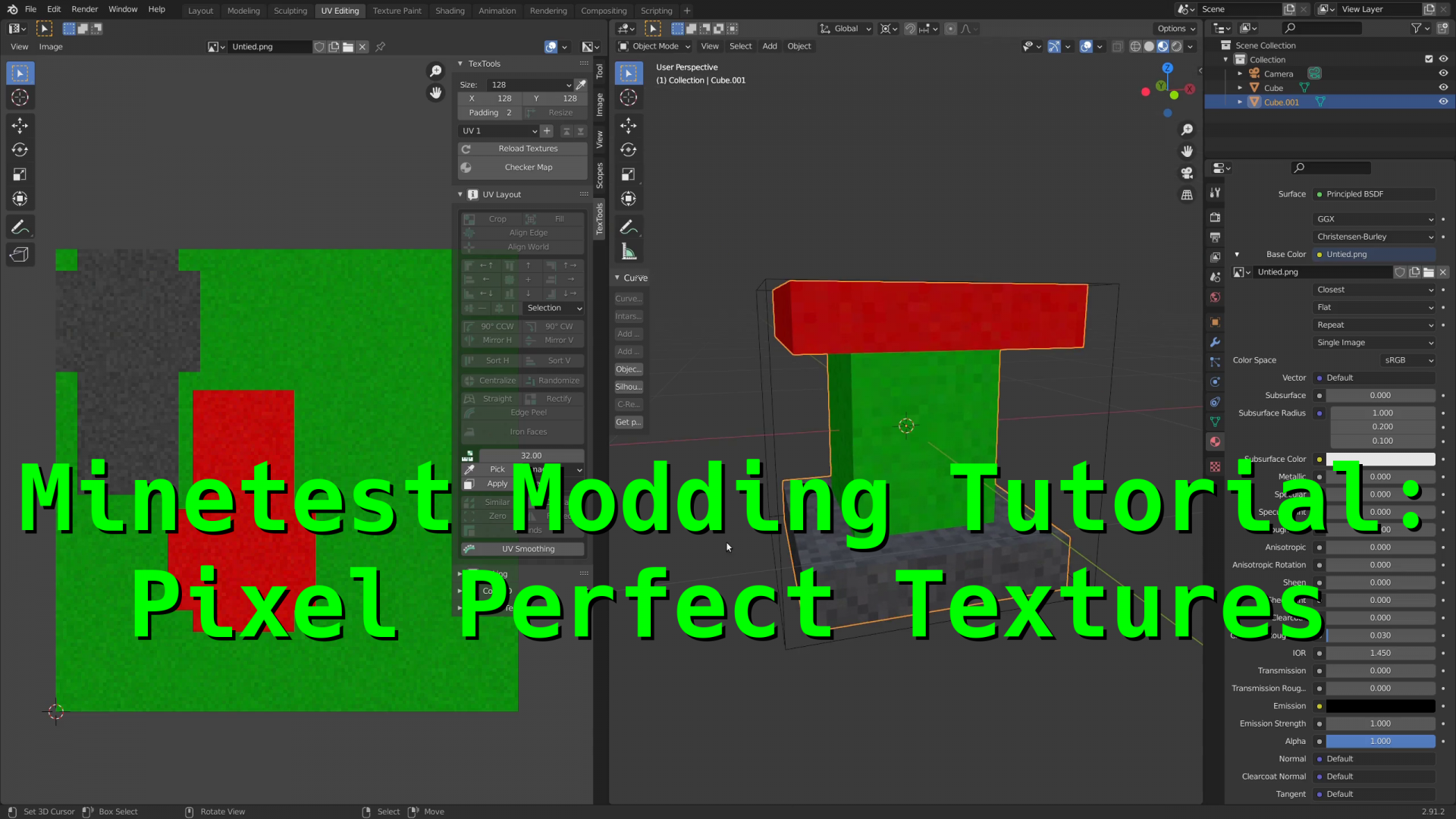In this video I'll be going over how to use the TexTools addon for Blender. This addon lets you very easily match your UV mapping to a specific texture resolution giving you perfectly aligned UVs so your textures remain consistent between standard nodes and mesh nodes.